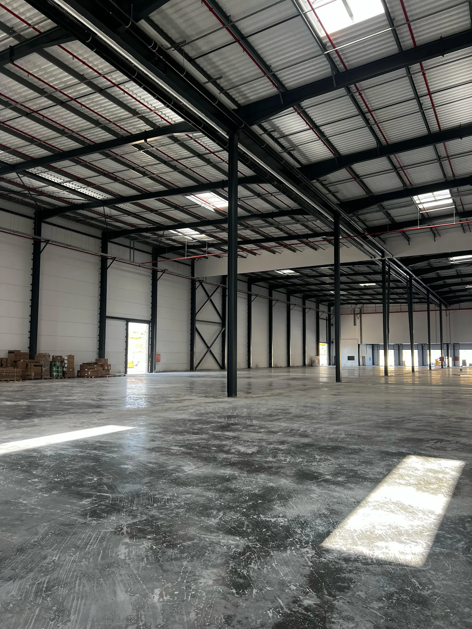 • Pavimento de alta resistencia pulido y sellado para tráfico intensivo de maquinaria logística.
